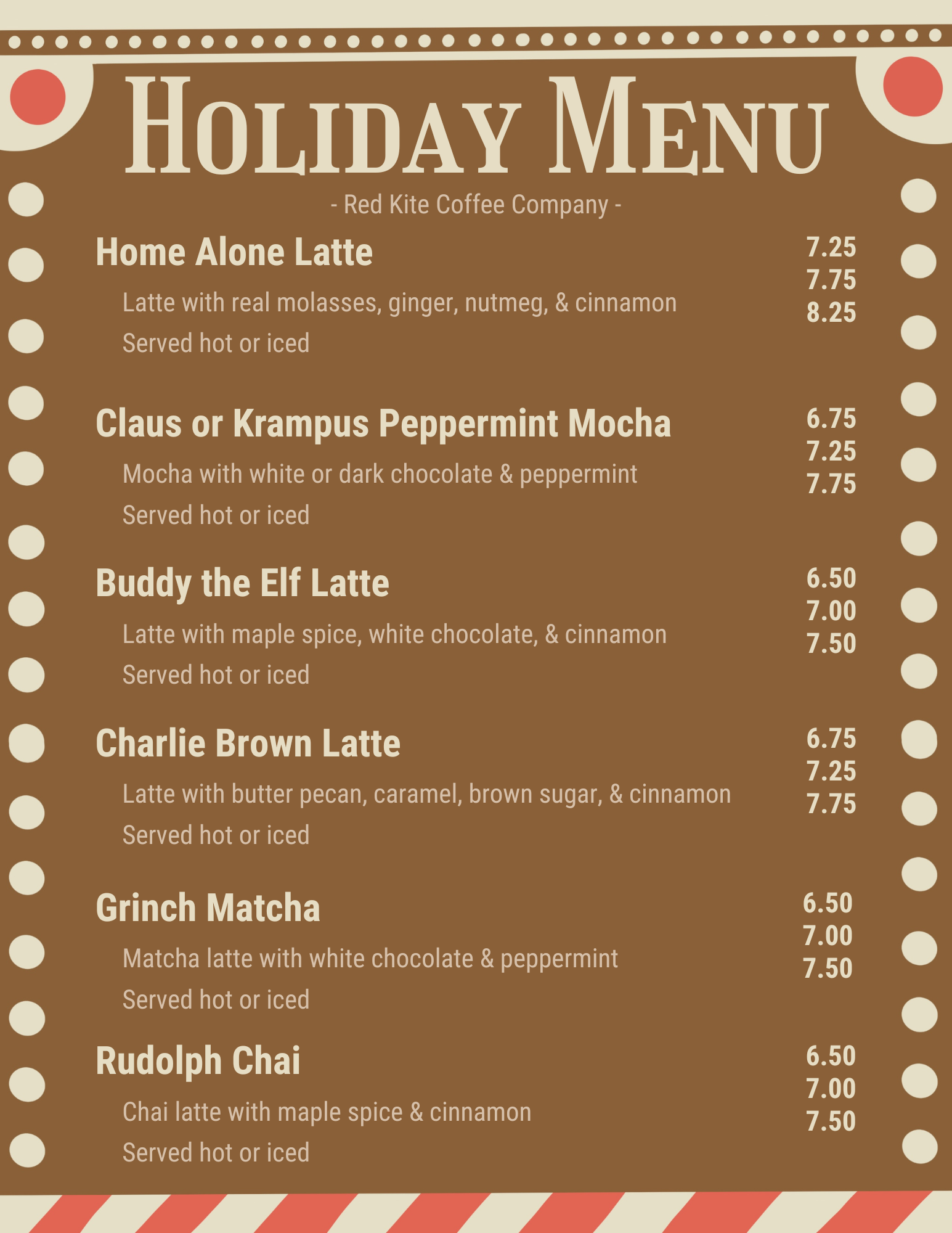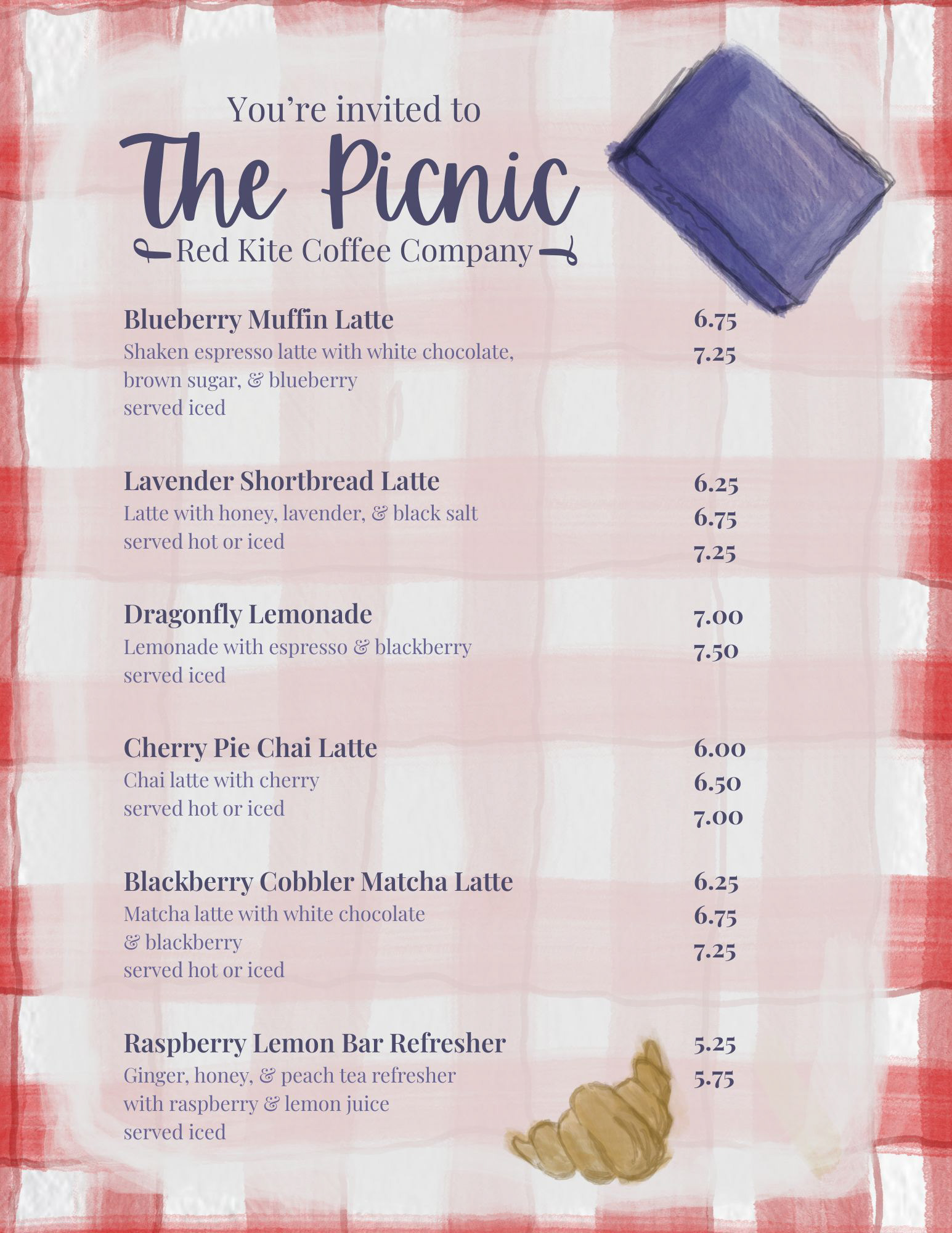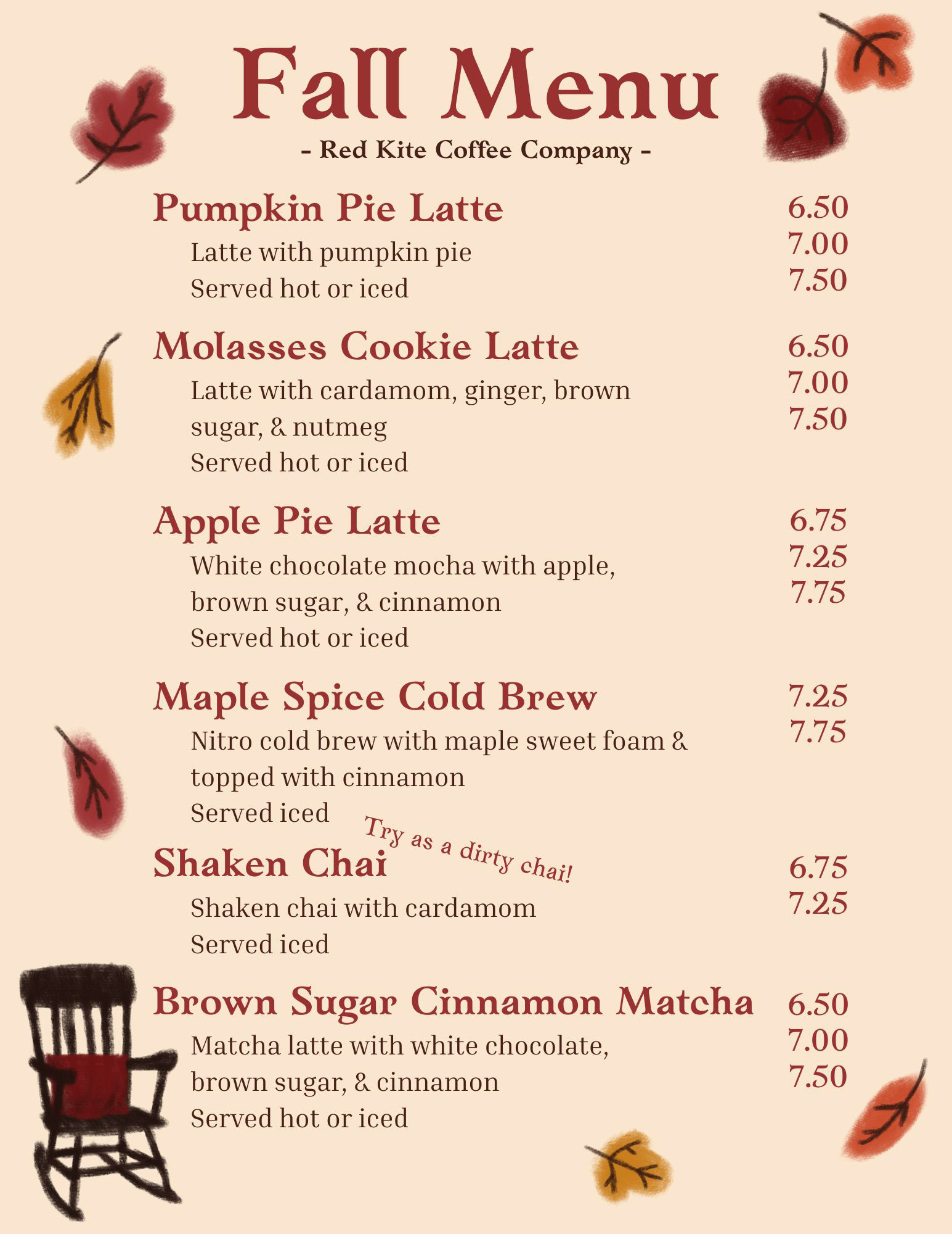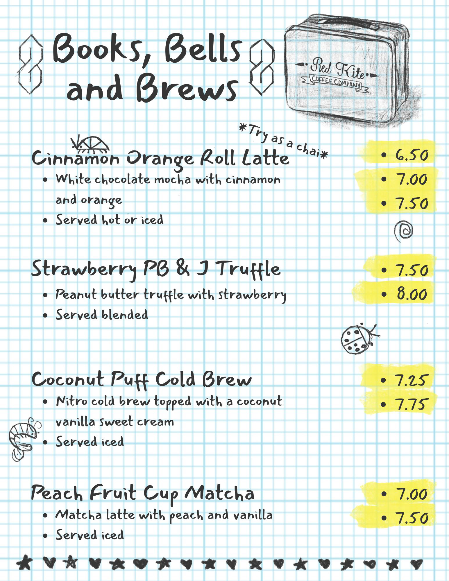 I work as a barista while attending my college classes. While I got promoted to Drink Trainer, I also requested to revise the current menu and create the new seasonal menus. While I make the backgrounds in Adobe platforms, I add the type and prices through Canva so that the owner canĀ edit the prices as needed.