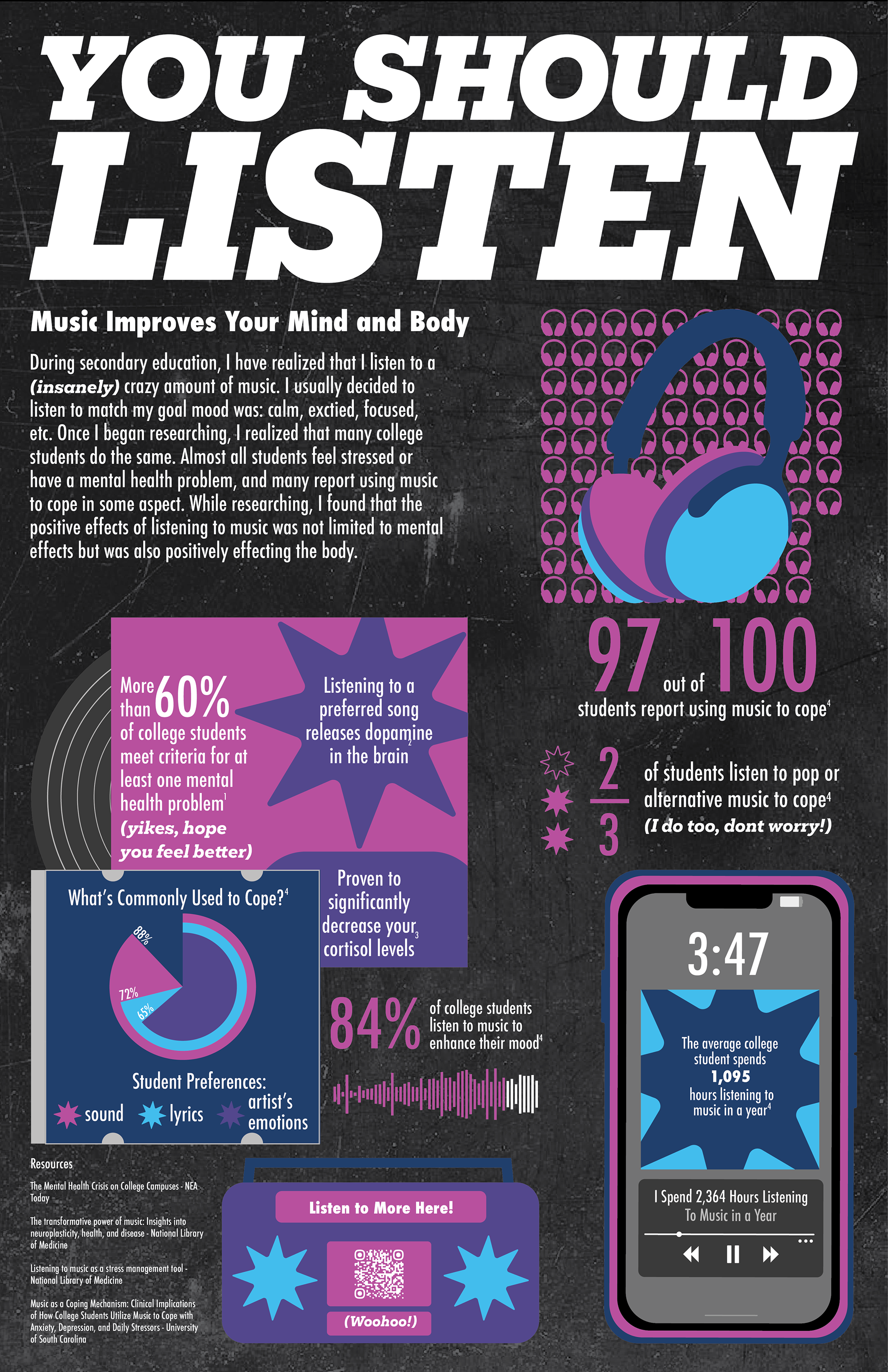 One of the first projects of my senior year was to track my habits and speculate about them on a global scale. I decided to focus on an overall positive habit, listening to music, to spread positivity. After researching for two weeks, I gathered my data set based on college students and began creating a visual language. I went through one complete restart and landed on the final iteration shown below. I included six different data visualizations, and I also added my personal data. The final step of the project was to create an animation that paired with the poster and further explored how the data visualizations moved.